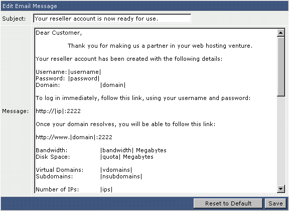 This is the e-mail address of the Reseller. It is the address where account notification will be sent, as well as being the default e-mail address in the Reseller's control panel.