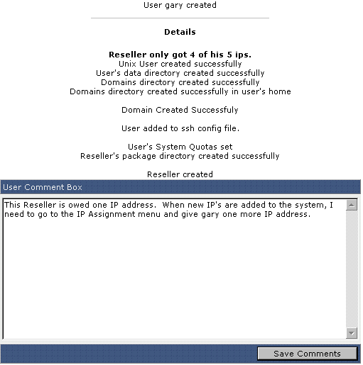 At this point, you may exit the control panel or navigate somewhere else within the panel. You do not need to click the "Save Comments" box unless you want to leave a note on the Reseller's account (only Admins can read the comments).