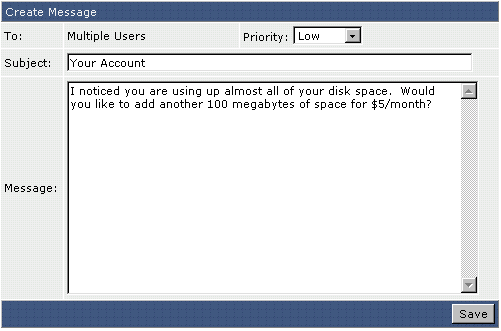 The "To:" field will say "Multiple Users" even if you only check one username in the table. Set the message priority, type in the subject and message body, then click "Save." |